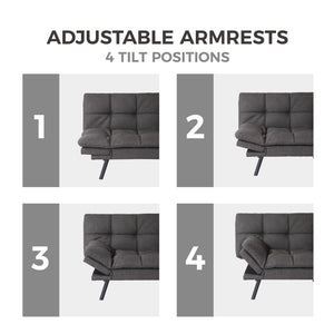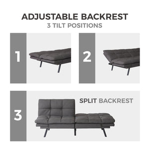 [Convertible Futon Sofa Bed] One form of sofa can not satisfy everyone, we can convert the sofa into different forms by converting the armrests and backrests. Use it to watch TV or convert it into a bed for sleeping, which can not only help us save space, but also more economical. [Safety and comfort] In order to produce a soft and comfortable sofa, we increased the thickness of the memory foam inside the sofa to 3 inches, which means that when we convert the sofa into a bed, we don't need extra pillows or topper to get a deep sleep, the raw materials of the sofa are certified by CertiPUR-US without adding any harmful chemicals to protect you and your family's safety. [Modern Loveseat] Modern design dark grey polyester fabric sofa can decorate compact living space with high end atmosphere. If you accidentally spill coffee, drink, tea or other stains on the sofa, you can easily scrub it clean with just a damp cloth or paper towel. [Sofa bed in a box] When we open the box to take out the sofa, we can follow the assembly video or instructions to easily complete the assembly, if you have any questions, our colleagues in the United States can easily help you solve.