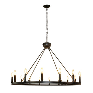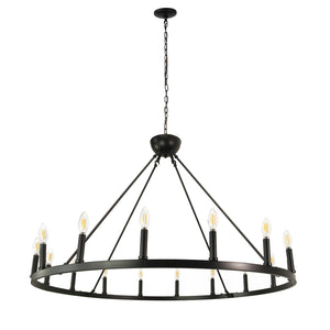 >Classic Wagon Wheel - Larger and wider than standard globe chandeliers, these “wheelsâ€?offer a minimalistic, yet eye-catching design that’s perfect for today’s modern homes. In fact, the sleek, matte black finish and 12-bulb design can help you create just the right atmosphere.