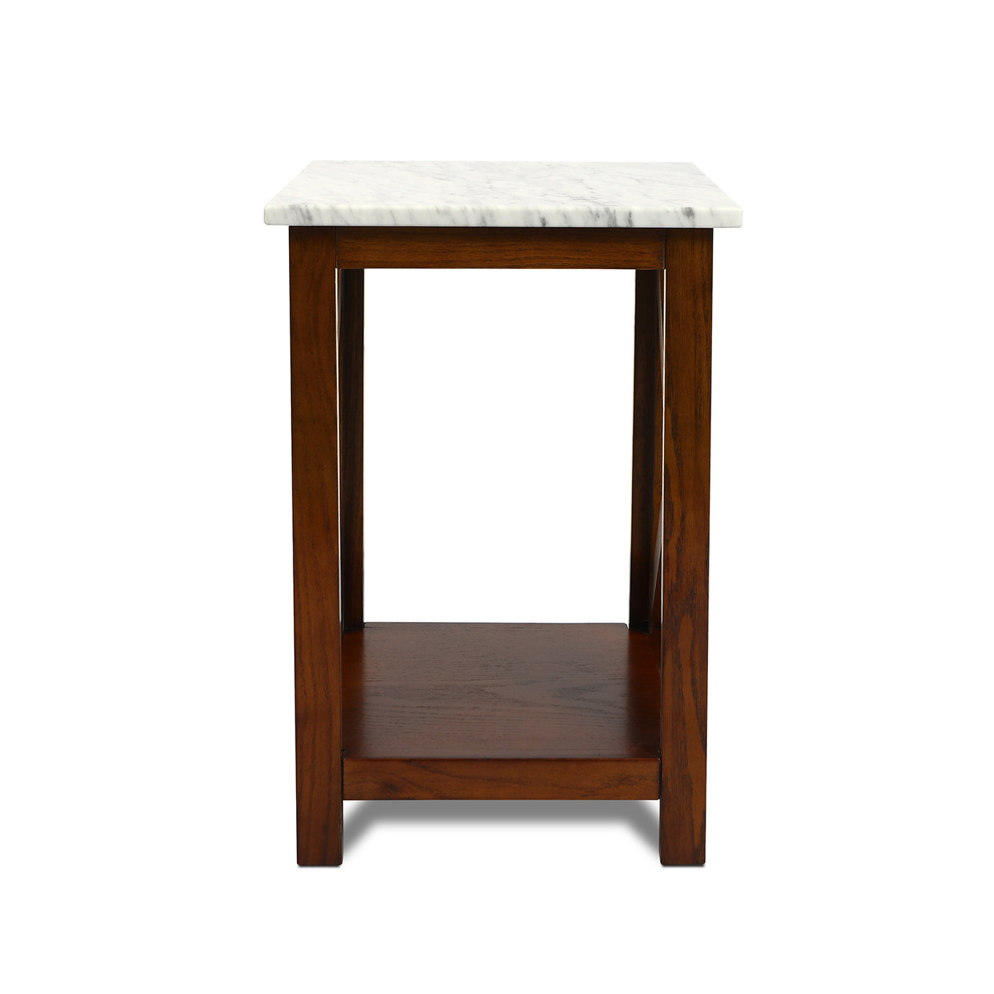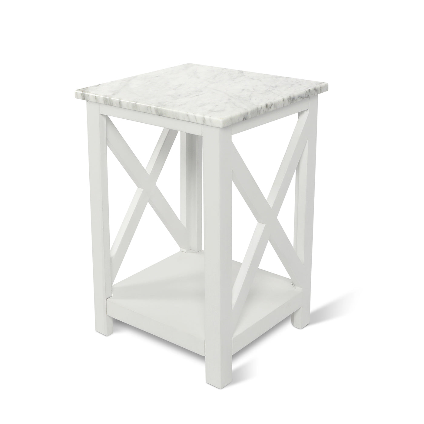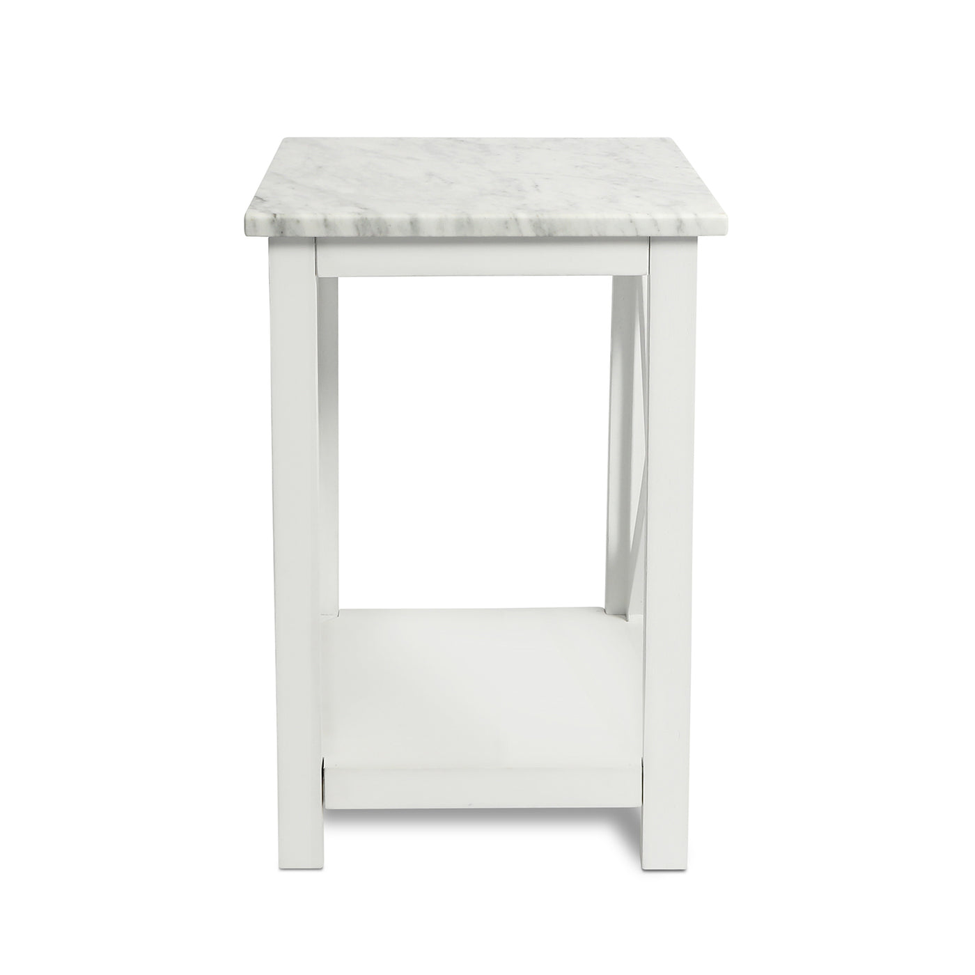 Description Up to the ante in your stylish space with an end table designed to steal the scene. This stunning marble-top end table. Fitted with a handy slatted shelf, it serves both as a stylish focal point and convenient storage. The solid white and grey Italian carrara marble is cut to a square shape modernized with curved mid-century edges. T...