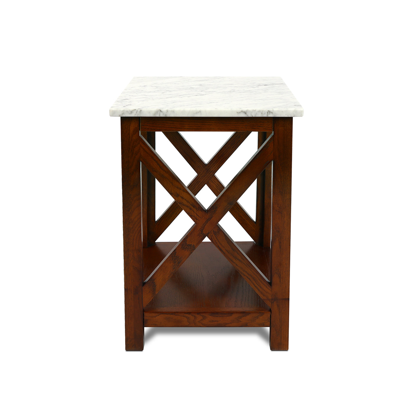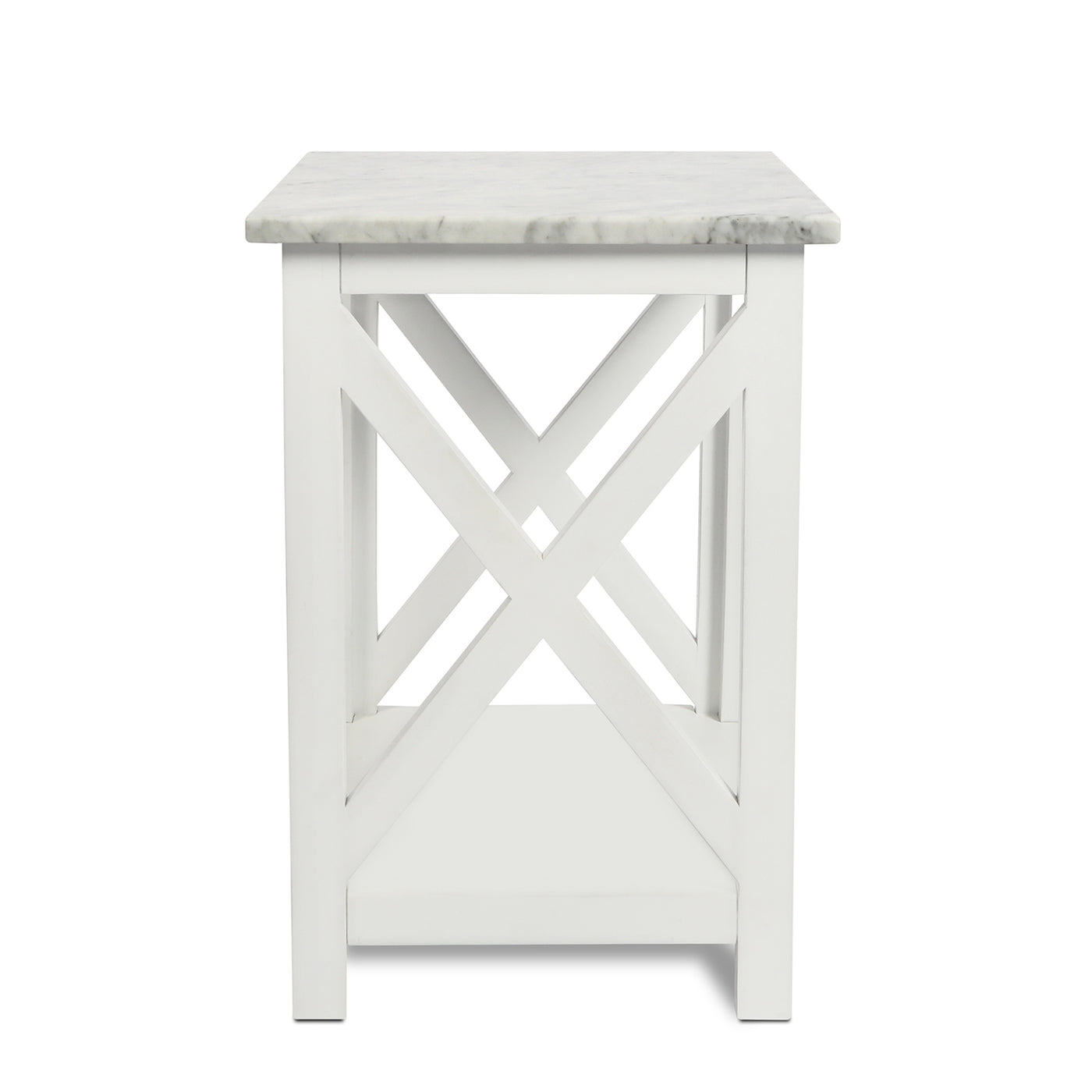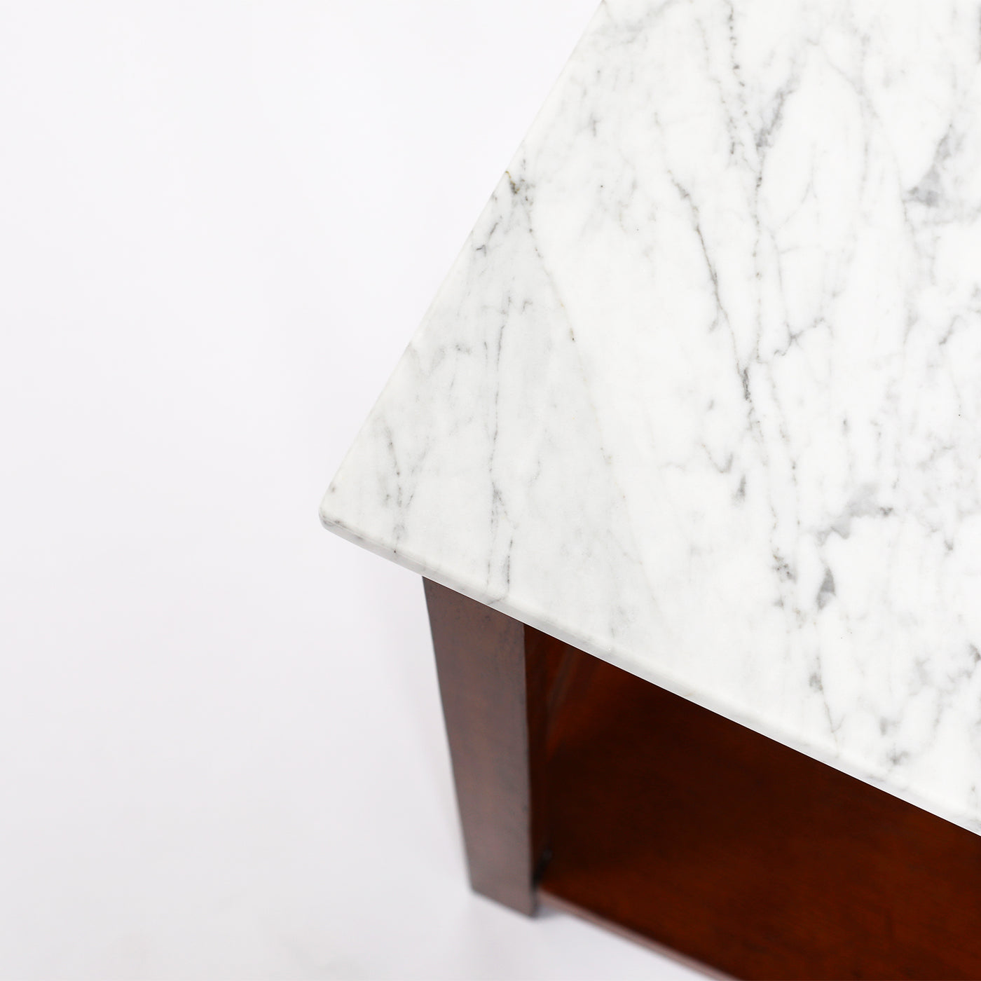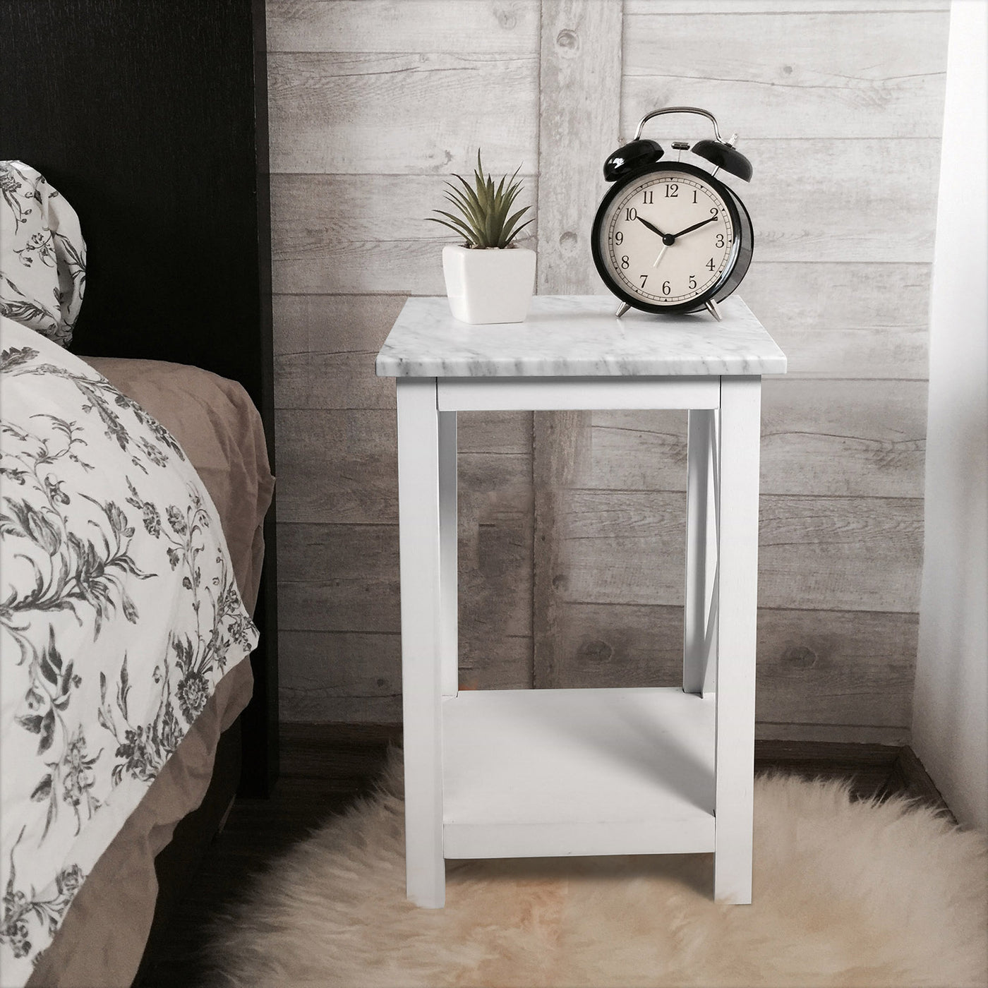 Description Up to the ante in your stylish space with an end table designed to steal the scene. This stunning marble-top end table. Fitted with a handy slatted shelf, it serves both as a stylish focal point and convenient storage. The solid white and grey Italian carrara marble is cut to a square shape modernized with curved mid-century edges. T...