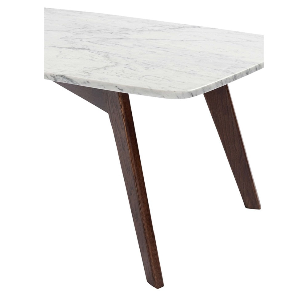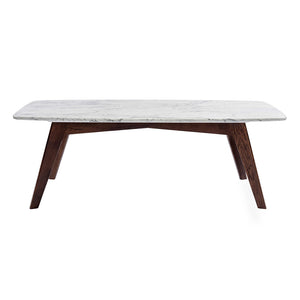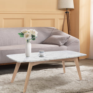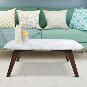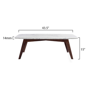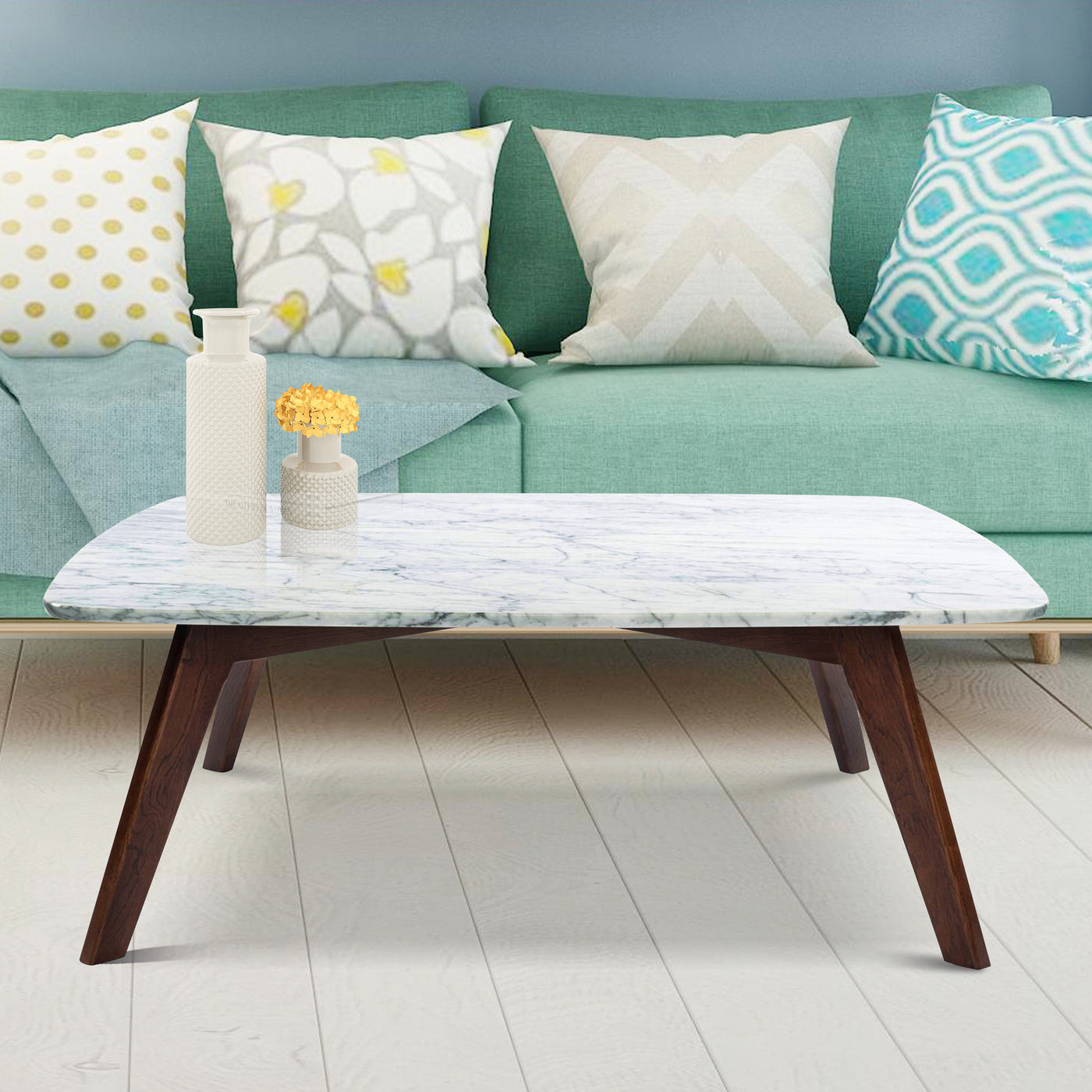 Description This Italian Carrara White Marble table with mid century wood legs is a chic nod to the past, and feels fresh in any modern living space. Durable marble surface protected by a sealant to prevent staining lets this piece weather well in your home. Thoughtful product development and design brings you a marble top coffee table with stud...