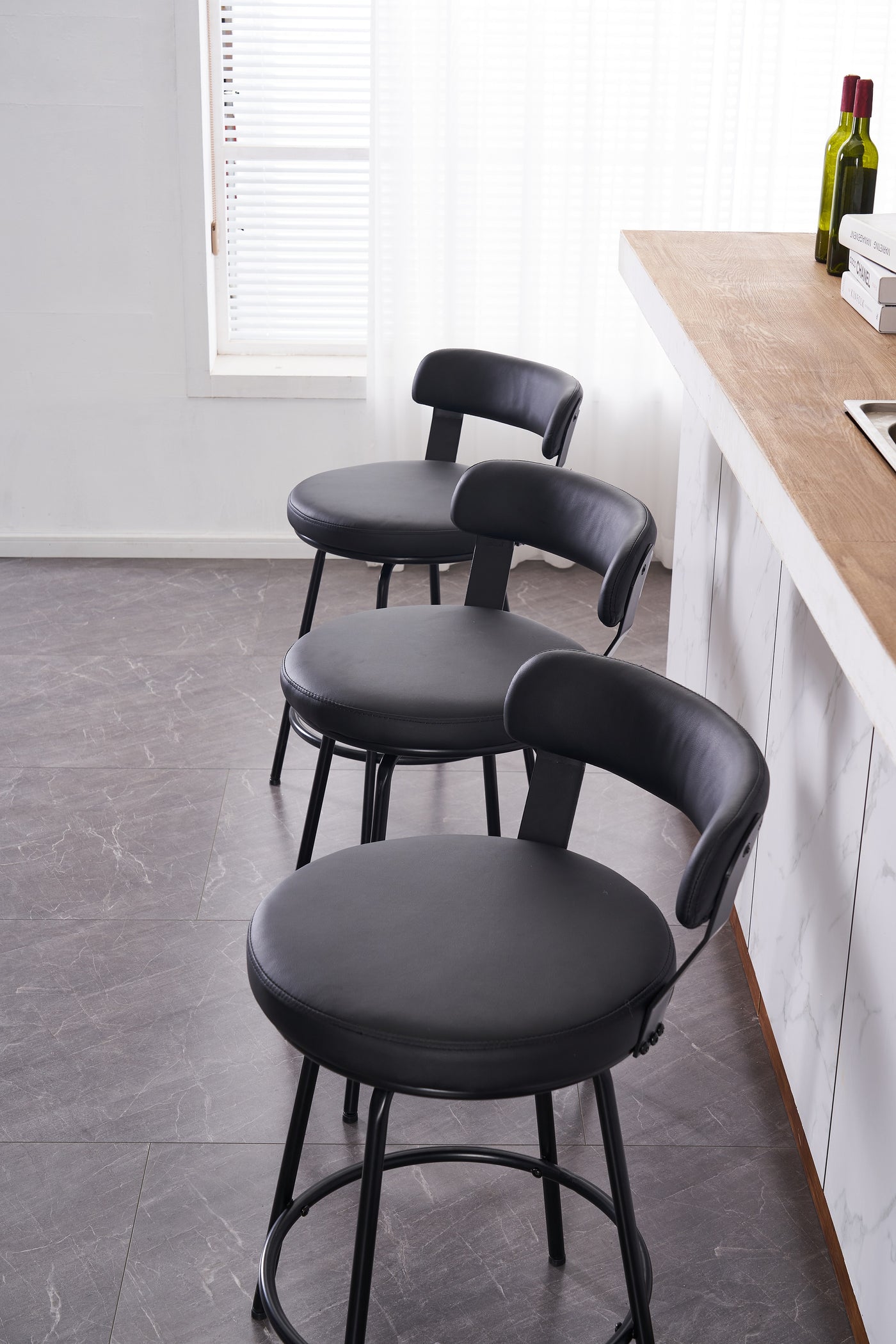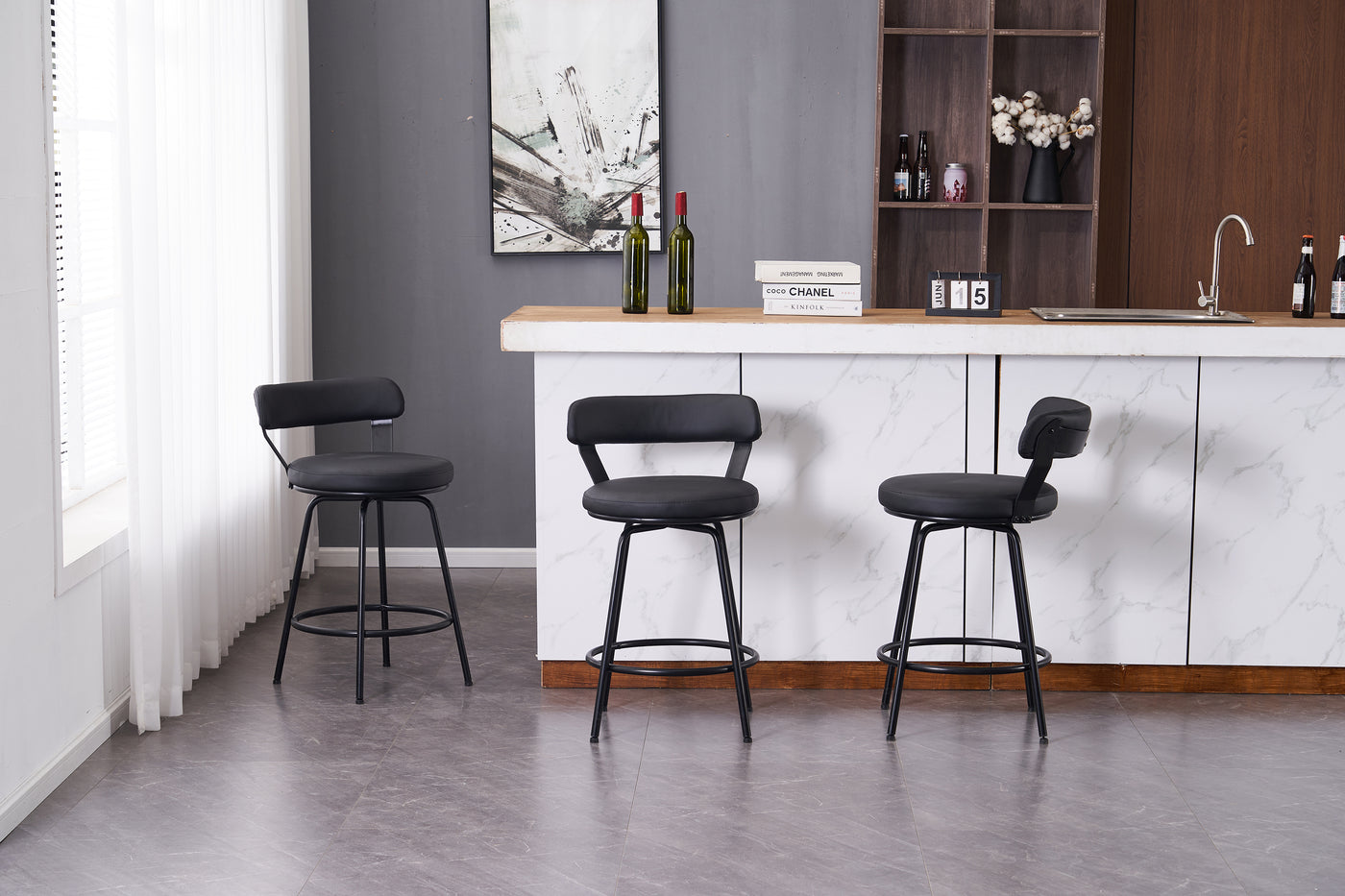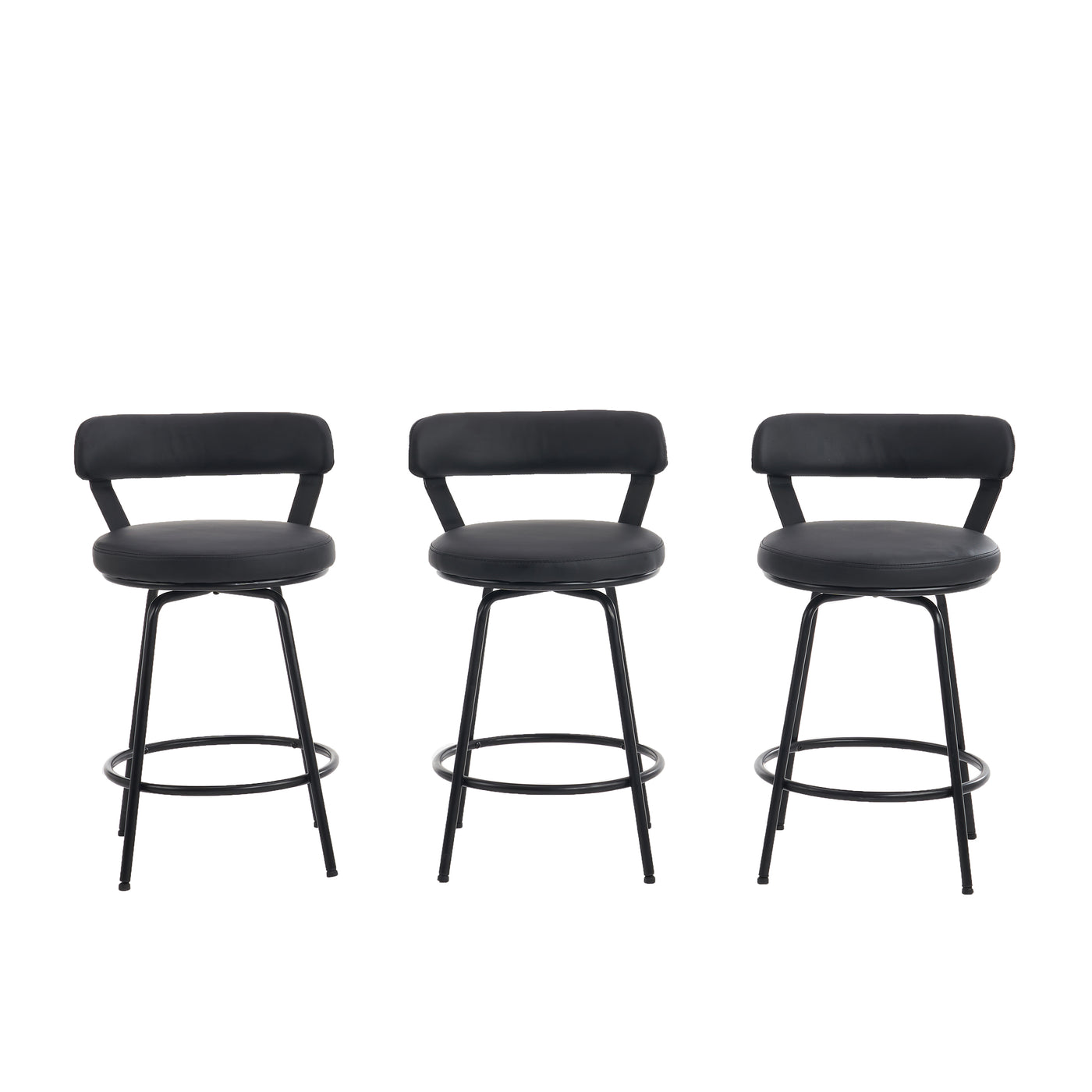 Add a touch of modern to your kitchen or basement with the set of three 24" Height Low Back Ashley swivel bar stools. The 360 degrees quiet, smooth swivel mechanism allows for ultimate movement. From morning breakfasts to evening cocktails this set of 3 bar stools is here to complete your space. Durable steel frame with a comfortable leather like cushion are a quick easy update that will instantly transform your room. The black metal finish and black faux leather look great in most modern, casual, transitional, and contemporary kitchens. The cushion has a high density foam for maximum comfort and lasting durability. The faux leather is easy to clean spills. Each leg comes with an adjustable foot for uneven floors. Holds up to 250 pounds. Easy to follow instruction are included for simple assembly.