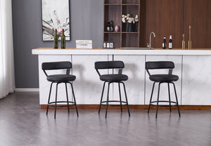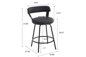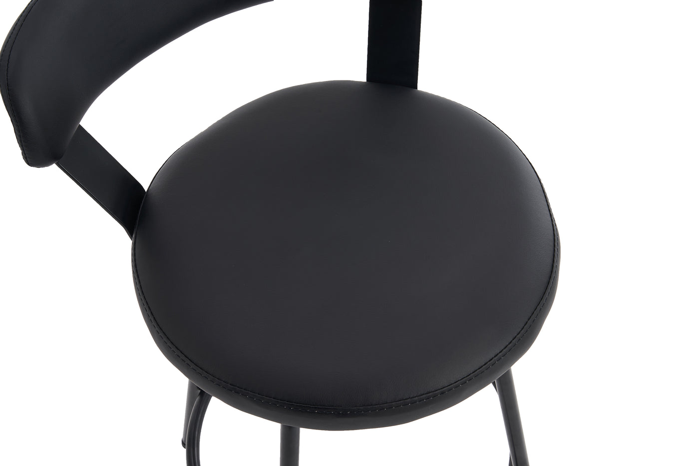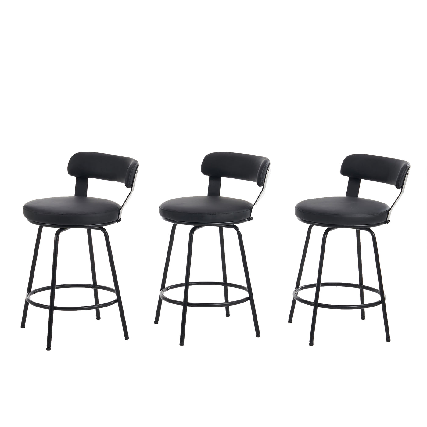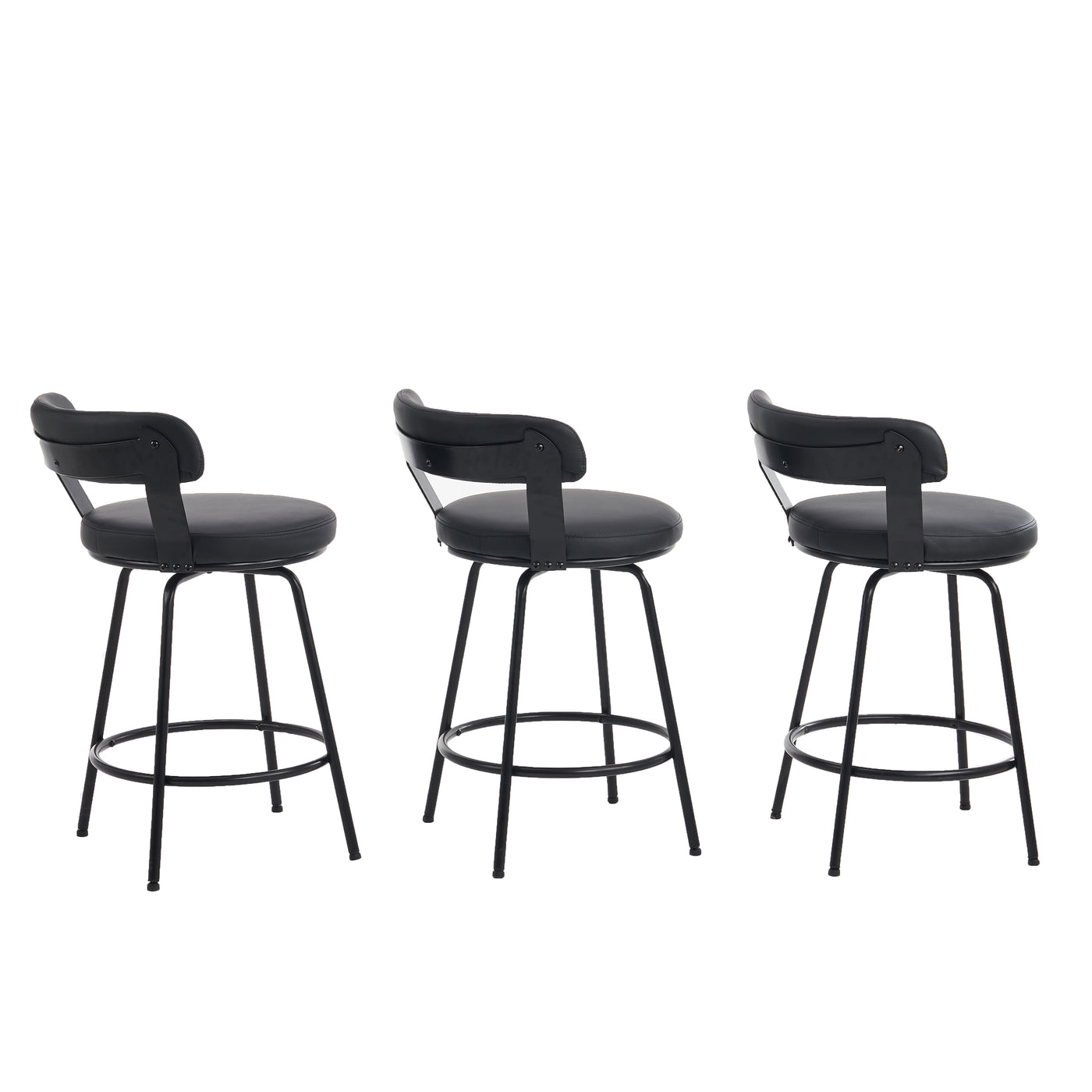 Add a touch of modern to your kitchen or basement with the set of three 24" Height Low Back Ashley swivel bar stools. The 360 degrees quiet, smooth swivel mechanism allows for ultimate movement. From morning breakfasts to evening cocktails this set of 3 bar stools is here to complete your space. Durable steel frame with a comfortable leather like cushion are a quick easy update that will instantly transform your room. The black metal finish and black faux leather look great in most modern, casual, transitional, and contemporary kitchens. The cushion has a high density foam for maximum comfort and lasting durability. The faux leather is easy to clean spills. Each leg comes with an adjustable foot for uneven floors. Holds up to 250 pounds. Easy to follow instruction are included for simple assembly.