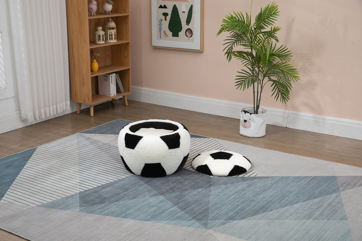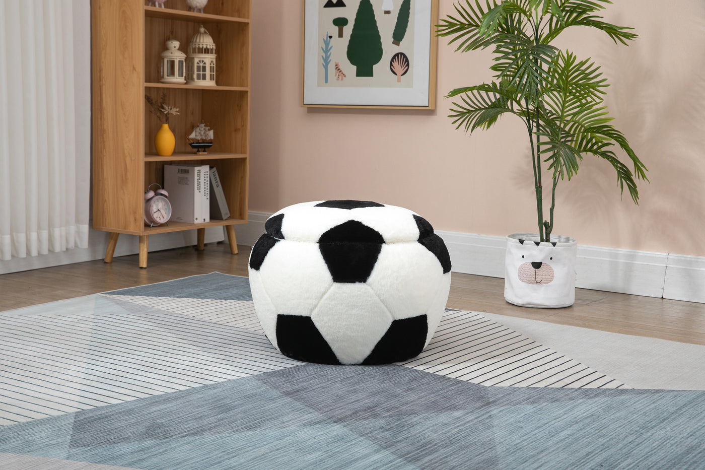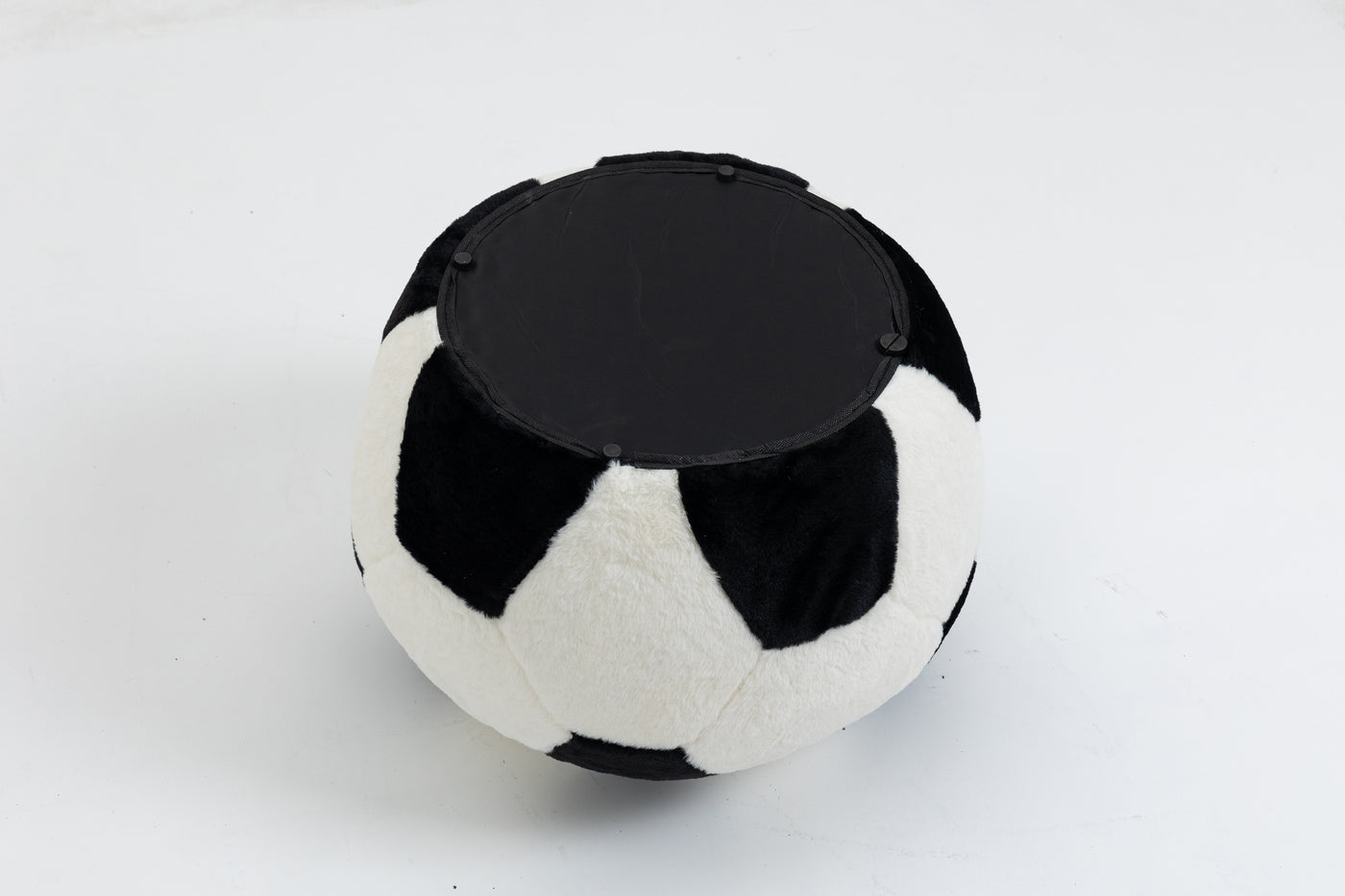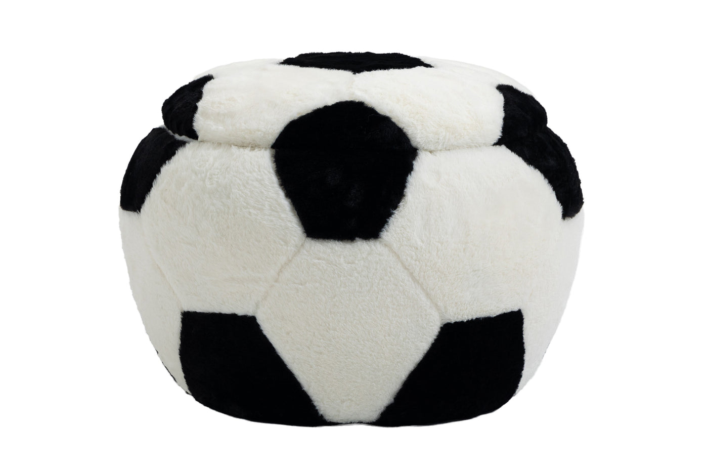 A perfect addition to any sports fans home, this functional and great looking ottoman provides a number of uses for multiple rooms in your home. A removable lid provides access to a much larger storage compartment than one would imagine. The soft fur-like plush fabric and great soccer ball design will be great in any room in your home. Great for basements, nuserys, and play rooms. No assembly required.