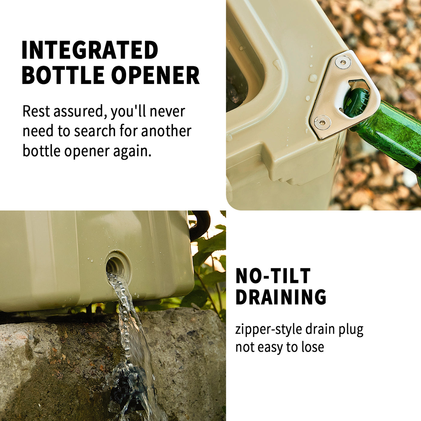 • ALL DETAILS: Silicon tension latches do not break easily or come loose automatically. UV inhibitors protect the cooler against sun damage. Anti-slide rubber feet help to keep stable. 2 impact rubber absorbing ergonomic grips on each side help easier moving. The drain plug allows you to remove water without turning the cooler upside down.