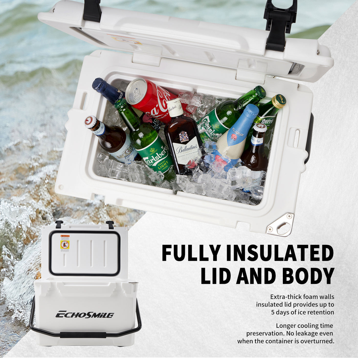 • ICE RETENTION: EchoSmile Rotomolded cooler keeps cold for up to 5 days with recommended 2:1 ice-to-contents. The intermediate insulation layer is made of polyurethane so as to provide superior insulative and high strength. The silicone sealing ring seals the whole space to avoid heat convection and prolong the cryopreservation time.