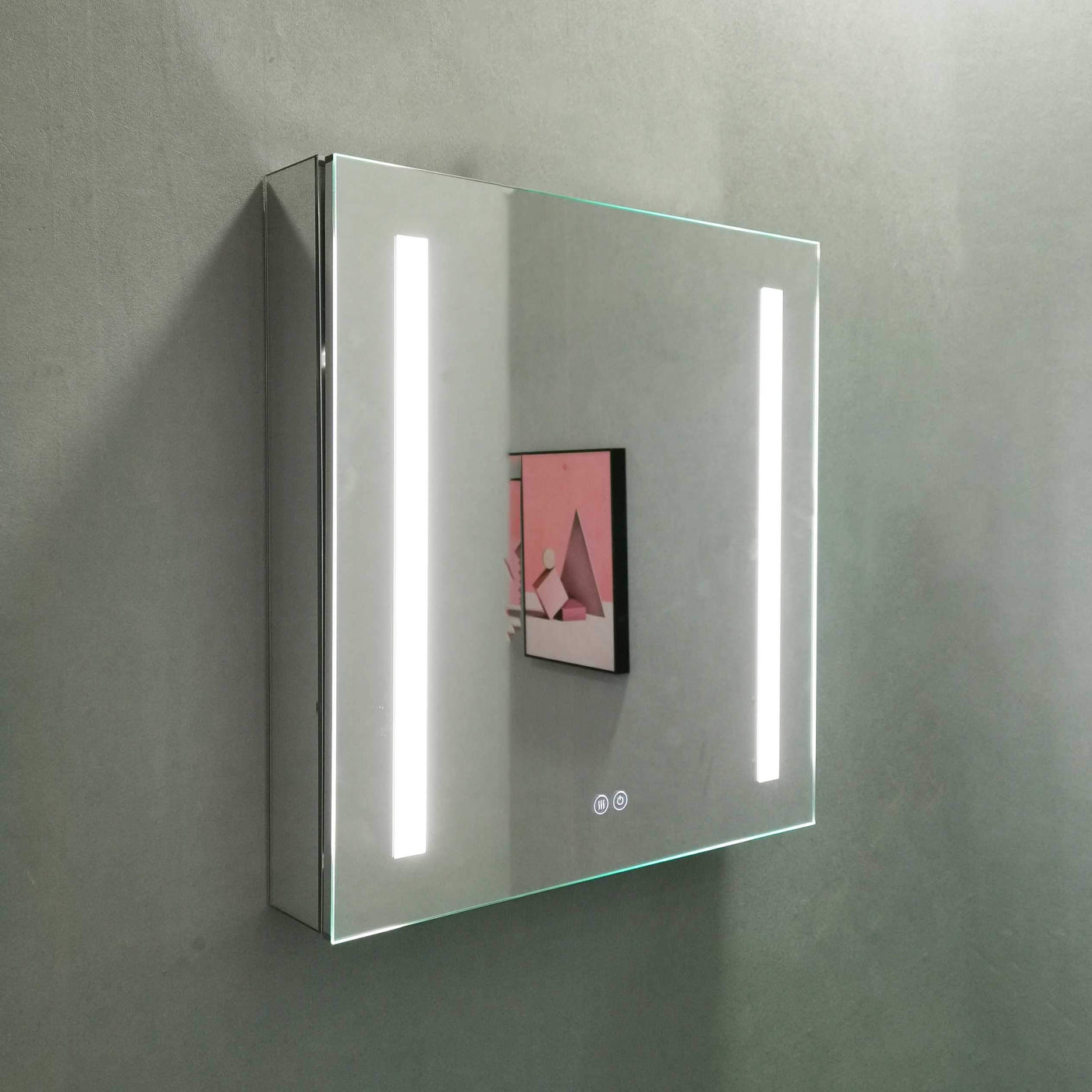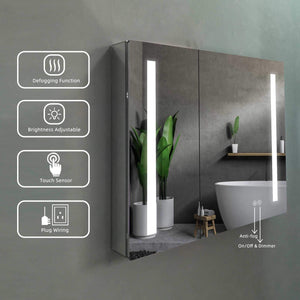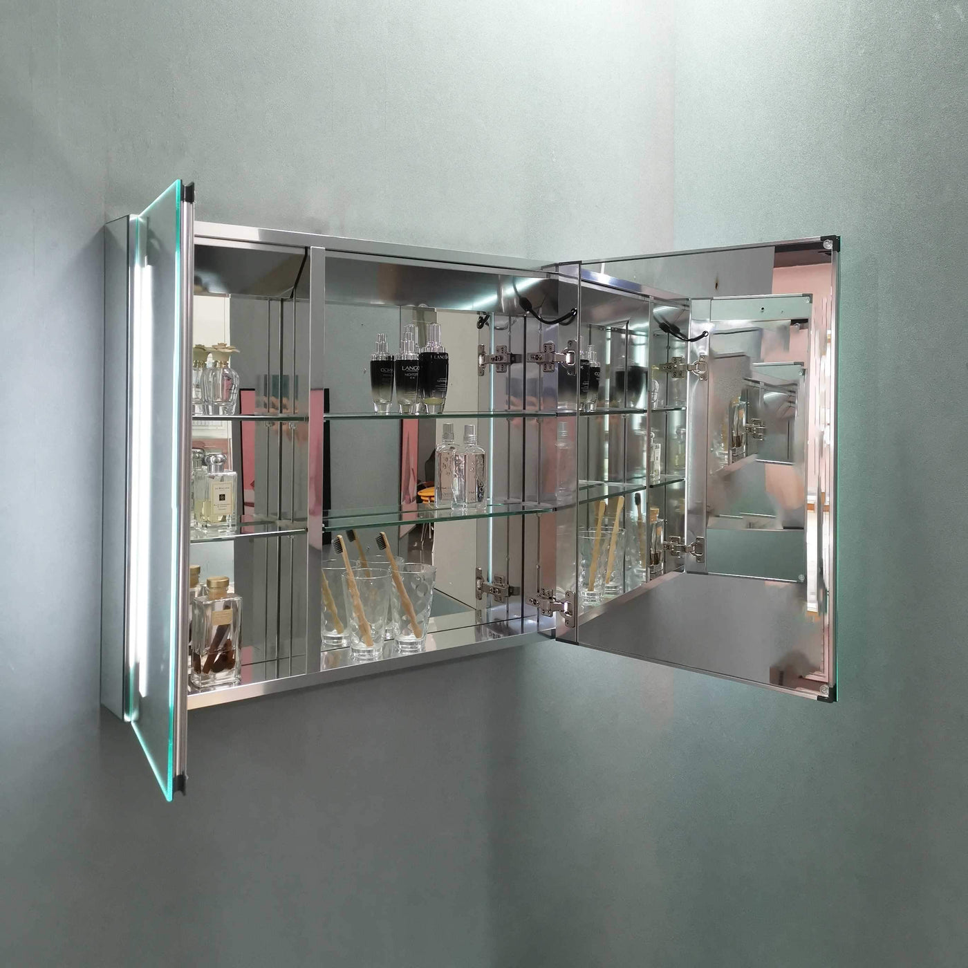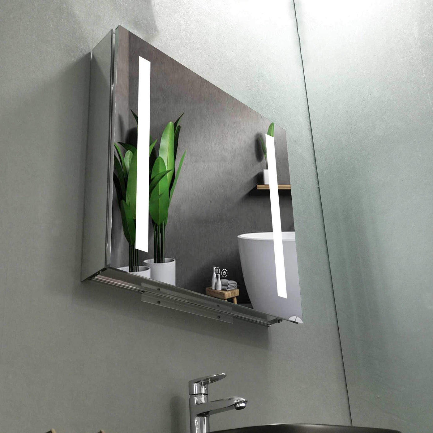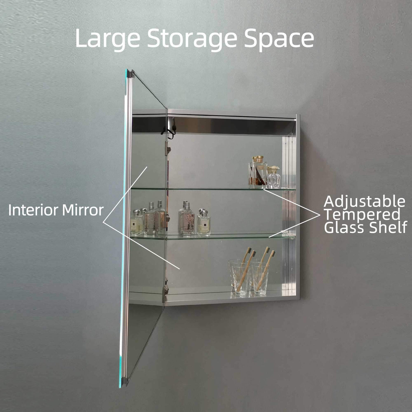 Why not come to pick up this modern and simple designed bathroom led mirror cabinet! The polished Anodized aluminum medicine cabinet is well fabricated with a double - sided mirrored door, adjustable tempered glass shelves,and dimming & memory function, the fog - free device will bring you all clear beauty in your mirror. The useful shelves help you organize your bath and makeup items, and enjoy your tidy space all the time. No headache to make as the pretty mirror cabinet is suitable for different bathroom styles, and applies both for surface mount and recessed mount installation.
