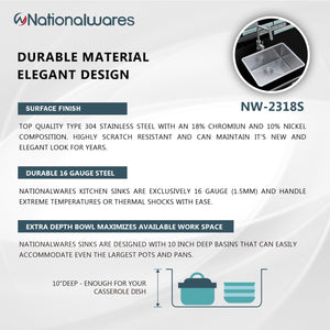 {"id":4646027591777,"title":"Nationalware Undermount Stainless Steel 23 in. Single Bowl Kitchen Sink","handle":"nw-2318s","description":"\u003ch2\u003e\u003cspan style=\"color: #e69138;\"\u003e\u003cstrong\u003eDescription\u003c\/strong\u003e\u003c\/span\u003e\u003c\/h2\u003e\n\u003cp\u003eCreating a style statement for traditional and contemporary interiors, the NW-2318S Undermount Stainless Steel Kitchen Sink is sure to be a great addition to your recently renovated modular kitchen. Crafted from the finest quality stainless steel, this sink is lightweight and durable. Featuring a square shape, this spacious sink comes with angled drain grooves that allow water to pass easily. Available with a satin finish, this stainless steel sink can be installed with ease. Simple to maintain, and highly functional in nature, the NW-2318S Undermount Stainless Steel Kitchen Sink comes with a multi-layer undercoating to dampen the sound while you are working in your kitchen.\u003c\/p\u003e\n\u003ch2\u003e\u003cspan style=\"color: #e69138;\"\u003eFeatures\u003c\/span\u003e\u003c\/h2\u003e\n\u003cmeta charset=\"utf-8\"\u003e\u003cstyle type=\"text\/css\"\u003e\u003c!--\ntd {border: 1px solid #ccc;}br {mso-data-placement:same-cell;}\n--\u003e\u003c\/style\u003e\n\u003cul\u003e\n\u003cli\u003e\u003cspan\u003eUndermounted stainless steel single basin kitchen sink\u003c\/span\u003e\u003c\/li\u003e\n\u003cli\u003e\u003cspan\u003eAngled drain grooves help direct water toward the drain and strainer\u003c\/span\u003e\u003c\/li\u003e\n\u003cli\u003e\u003cspan\u003eStrainer included\u003c\/span\u003e\u003c\/li\u003e\n\u003cli\u003e\u003cspan\u003eMulti-layer undercoating to help reduce noise when the sink is in use\u003c\/span\u003e\u003c\/li\u003e\n\u003cli\u003e\u003cspan\u003eSatin Finish\u003c\/span\u003e\u003c\/li\u003e\n\u003cli\u003e\u003cspan\u003e16 Gauge Thick 304 Stainless Steel\u003c\/span\u003e\u003c\/li\u003e\n\u003cli\u003e\u003cspan\u003eOveral product dimensions: 23\" L x 18\" W x 10\" H\u003c\/span\u003e\u003c\/li\u003e\n\u003cli\u003e\u003cspan\u003eCertified and listed by UPC, cUPC, CSA, IAPMO, ANSI and SCC\u003c\/span\u003e\u003c\/li\u003e\n\u003c\/ul\u003e\n\u003ch2\u003e\u003cspan style=\"color: #e69138;\"\u003eDetails\u003c\/span\u003e\u003c\/h2\u003e\n\u003ctable style=\"width: 98.484%;\"\u003e\n\u003ctbody\u003e\n\u003ctr\u003e\n\u003ctd style=\"width: 48%;\"\u003e\u003cstrong\u003e\u003cspan style=\"color: #e69138;\"\u003eWeight\u003c\/span\u003e\u003c\/strong\u003e\u003c\/td\u003e\n\u003ctd style=\"width: 46.6698%;\"\u003e\u003cspan\u003e20 lbs\u003c\/span\u003e\u003c\/td\u003e\n\u003c\/tr\u003e\n\u003ctr\u003e\n\u003ctd style=\"width: 48%;\"\u003e\u003cstrong\u003e\u003cspan style=\"color: #e69138;\"\u003eDimensions(in.)\u003c\/span\u003e\u003c\/strong\u003e\u003c\/td\u003e\n\u003ctd style=\"width: 46.6698%;\"\u003e\u003cspan\u003e23 x 18 x 10\u003c\/span\u003e\u003c\/td\u003e\n\u003c\/tr\u003e\n\u003ctr\u003e\n\u003ctd style=\"width: 48%;\"\u003e\u003cstrong\u003e\u003cspan style=\"color: #e69138;\"\u003eMaterial\u003c\/span\u003e\u003c\/strong\u003e\u003c\/td\u003e\n\u003ctd style=\"width: 46.6698%;\"\u003e\u003cspan\u003e304 Stainless Steel\u003c\/span\u003e\u003c\/td\u003e\n\u003c\/tr\u003e\n\u003ctr\u003e\n\u003ctd style=\"width: 48%;\"\u003e\u003cstrong\u003e\u003cspan style=\"color: #e69138;\"\u003eFinish\u003c\/span\u003e\u003c\/strong\u003e\u003c\/td\u003e\n\u003ctd style=\"width: 46.6698%;\"\u003e\u003cspan\u003eSatin\u003c\/span\u003e\u003c\/td\u003e\n\u003c\/tr\u003e\n\u003ctr\u003e\n\u003ctd style=\"width: 48%;\"\u003e\u003cstrong\u003e\u003cspan style=\"color: #e69138;\"\u003eGauge\u003c\/span\u003e\u003c\/strong\u003e\u003c\/td\u003e\n\u003ctd style=\"width: 46.6698%;\"\u003e\u003cspan\u003e16\u003c\/span\u003e\u003c\/td\u003e\n\u003c\/tr\u003e\n\u003ctr\u003e\n\u003ctd style=\"width: 48%;\"\u003e\u003cstrong\u003e\u003cspan style=\"color: #e69138;\"\u003eSink Mount\u003c\/span\u003e\u003c\/strong\u003e\u003c\/td\u003e\n\u003ctd style=\"width: 46.6698%;\"\u003e\u003cspan\u003eUndermount\u003c\/span\u003e\u003c\/td\u003e\n\u003c\/tr\u003e\n\u003ctr\u003e\n\u003ctd style=\"width: 48%;\"\u003e\u003cstrong\u003e\u003cspan style=\"color: #e69138;\"\u003eSink Shape\u003c\/span\u003e\u003c\/strong\u003e\u003c\/td\u003e\n\u003ctd style=\"width: 46.6698%;\"\u003e\u003cspan\u003eRectangular\u003c\/span\u003e\u003c\/td\u003e\n\u003c\/tr\u003e\n\u003ctr\u003e\n\u003ctd style=\"width: 48%;\"\u003e\u003cstrong\u003e\u003cspan style=\"color: #e69138;\"\u003eBasin Top to Bottom Depth(in.)\u003c\/span\u003e\u003c\/strong\u003e\u003c\/td\u003e\n\u003ctd style=\"width: 46.6698%;\"\u003e10\u003c\/td\u003e\n\u003c\/tr\u003e\n\u003ctr\u003e\n\u003ctd style=\"width: 48%;\"\u003e\u003cstrong\u003e\u003cspan style=\"color: #e69138;\"\u003eCut-Out Left to Right Length(in.)\u003c\/span\u003e\u003c\/strong\u003e\u003c\/td\u003e\n\u003ctd style=\"width: 46.6698%;\"\u003e 23\u003c\/td\u003e\n\u003c\/tr\u003e\n\u003ctr\u003e\n\u003ctd style=\"width: 48%;\"\u003e\u003cstrong\u003e\u003cspan style=\"color: #e69138;\"\u003eCut-Out Front to Back Width(in.)\u003c\/span\u003e\u003c\/strong\u003e\u003c\/td\u003e\n\u003ctd style=\"width: 46.6698%;\"\u003e18\u003c\/td\u003e\n\u003c\/tr\u003e\n\u003ctr\u003e\n\u003ctd style=\"width: 48%;\"\u003e\u003cstrong\u003e\u003cspan style=\"color: #e69138;\"\u003eCut-Out Below Counter Depth(in.)\u003c\/span\u003e\u003c\/strong\u003e\u003c\/td\u003e\n\u003ctd style=\"width: 46.6698%;\"\u003e10\u003c\/td\u003e\n\u003c\/tr\u003e\n\u003ctr\u003e\n\u003ctd style=\"width: 48%;\"\u003e\u003cstrong\u003e\u003cspan style=\"color: #e69138;\"\u003eInner Basin Left to Right Length(in.)\u003c\/span\u003e\u003c\/strong\u003e\u003c\/td\u003e\n\u003ctd style=\"width: 46.6698%;\"\u003e21\u003c\/td\u003e\n\u003c\/tr\u003e\n\u003ctr\u003e\n\u003ctd style=\"width: 48%;\"\u003e\u003cstrong\u003e\u003cspan style=\"color: #e69138;\"\u003eInner Basin Front to Back Width(in.)\u003c\/span\u003e\u