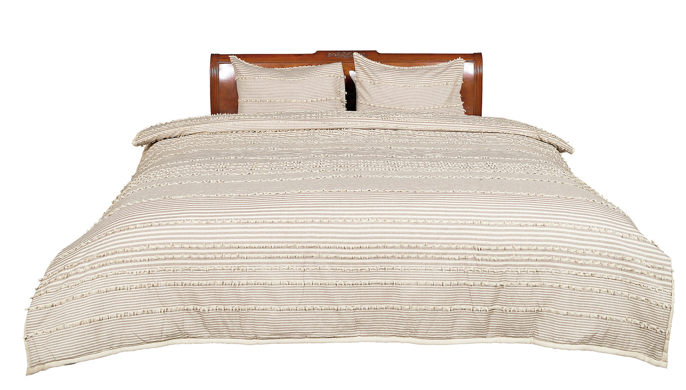 {"id":6986030284897,"title":"Uneven Stripe Beige and Brown Cotton Comforter Set","handle":"uneven-stripe-beige-and-brown-cotton-comforter-set","description":"\u003ch2 data-mce-fragment=\"1\"\u003e\u003cspan style=\"color: #ff8000;\" data-mce-fragment=\"1\" data-mce-style=\"color: #ff8000;\"\u003e\u003cstrong data-mce-fragment=\"1\"\u003eDescription\u003c\/strong\u003e\u003c\/span\u003e\u003c\/h2\u003e\n\u003cp data-mce-fragment=\"1\"\u003eBring a timeless look to your bedroom's decor with this exquisitely crafted 3-Piece beige and brown Textured Stripe Comforter Set. Made with 100% Cotton and featuring soft, textured brown stripes over a beige background, this comforter’s top quality workmanship only adds to its versatile looks that you can enjoy all year round. The textured, yarn dye striped pattern adds a modern farmhouse element, offering the perfect touch for a comfy, cozy retreat. Two pillow shams and an oversized comforter make it easy to set up your guest room or master bed, and the machine washable construction is effortless to maintain.\u003c\/p\u003e\n\u003ch2 data-mce-fragment=\"1\"\u003e\u003cspan style=\"color: #ff8000;\" data-mce-fragment=\"1\" data-mce-style=\"color: #ff8000;\"\u003e\u003cstrong data-mce-fragment=\"1\"\u003eOverview\u003c\/strong\u003e\u003c\/span\u003e\u003c\/h2\u003e\n\u003cp data-mce-fragment=\"1\"\u003e\u003cspan data-mce-fragment=\"1\"\u003e\u0026gt;Includes comforter and sham\u003c\/span\u003e\u003c\/p\u003e\n\u003cp data-mce-fragment=\"1\"\u003e\u003cspan data-mce-fragment=\"1\"\u003e\u0026gt;Premium Materials - Crafted with premium pure cotton and polyester fill for breathability and superb moisture absorption ability to ensure a cozy, comfortable, and refreshing sleep.\u003c\/span\u003e\u003c\/p\u003e\n\u003cp data-mce-fragment=\"1\"\u003e\u003cspan data-mce-fragment=\"1\"\u003e\u0026gt;Designed with a textured feel offering the perfect accent to your bed\u003c\/span\u003e\u003c\/p\u003e\n\u003cp data-mce-fragment=\"1\"\u003e\u003cspan data-mce-fragment=\"1\"\u003e\u0026gt;Durable and Long-lasting Crafted using a specialize coloring process and robust sewing technique ensuring exceptional color properties, durability and strength.\u003c\/span\u003e\u003c\/p\u003e\n\u003cp data-mce-fragment=\"1\"\u003e\u003cspan data-mce-fragment=\"1\"\u003e\u0026gt;Features clean, duvet-like finishing on top of the bed with hidden bar tacking.\u003c\/span\u003e\u003c\/p\u003e\n\u003cp data-mce-fragment=\"1\"\u003e\u003cspan data-mce-fragment=\"1\"\u003e\u0026gt;Easy Care - Machine wash warm, tumble dry low, do not bleach, warm iron if required. Dry cleanable\u003c\/span\u003e\u003c\/p\u003e\n\u003cp data-mce-fragment=\"1\"\u003e\u003cspan data-mce-fragment=\"1\"\u003e\u0026gt;Applicable in all season\u003c\/span\u003e\u003c\/p\u003e\n\u003cp data-mce-fragment=\"1\"\u003e\u003cspan data-mce-fragment=\"1\"\u003e\/\/\/ wayfair ||| https:\/\/www.wayfair.com\/bed-bath\/pdp\/dakota-fields-elara-beige-and-brown-cotton-twin-comforter-set-w100149986.html?piid=690124100%2C690124102\u003cbr\u003e\u003c\/span\u003e\u003c\/p\u003e","published_at":"2023-06-16T23:46:41-07:00","created_at":"2023-06-16T23:46:41-07:00","vendor":"Ninety Six","type":"Bedding","tags":["Bedding Comforter Set","Comforter Bed Set","Comforter Set","Reversible Comforter Set","Striped Comforter Set"],"price":899,"price_min":899,"price_max":1099,"available":false,"price_varies":true,"compare_at_price":10000,"compare_at_price_min":10000,"compare_at_price_max":16300,"compare_at_price_varies":true,"variants":[{"id":40871371210849,"title":"Twin","option1":"Twin","option2":null,"option3":null,"sku":"96-143166-T","requires_shipping":true,"taxable":true,"featured_image":{"id":32675974709345,"product_id":6986030284897,"position":1,"created_at":"2023-06-16T23:46:41-07:00","updated_at":"2023-10-17T01:32:59-07:00","alt":null,"width":2000,"height":1355,"src":"\/\/jhomecommerce.myshopify.com\/cdn\/shop\/files\/96-143166-T_L01.jpg?v=1697531579","variant_ids":[40871371210849]},"available":false,"name":"Uneven Stripe Beige and Brown Cotton Comforter Set - Twin","public_title":"Twin","options":["Twin"],"price":899,"weight":2821,"compare_at_price":10000,"inventory_management":"shopify","barcode":"196648025755","featured_media":{"alt":null,"id":25049221070945,"position":1,"preview_image":{"aspect_ratio":1.476,"height":1355,"width":2000,"src":"\/\/jhomecommerce.myshopify.com\/cdn\/shop\/files\/96-143166-T_L01.jpg?v=1697531579"}},"requires_selling_plan":false,"selling_plan_allocations":[]},{"id":40871371243617,"title":"Queen","option1":"Queen","option2":null,"option3":null,"sku":"96-143166-Q","requires_shipping":true,"taxable":true,"featured_image":{"id":32675975037025,"product_id":6986030284897,"position":24,"created_at":"2023-06-16T23:46:41-07:00","updated_at":"2023-06-16T23:46:53-07:00","alt":null,"width":2000,"height":1355,"src":"\/\/jhomecommerce.myshopify.com\/cdn\/shop\/files\/96-143166-Q_L01.jpg?v=1686984413","variant_ids":[40871371243617,40871371276385]},"available":false,"name":"Uneven Stripe Beige and Brown Cotton Comforter Set - Queen","public_title":"Queen","options":["Queen"],"price":999,"weight":3620,"compare_at_price":13900,"inventory_management":"shopify","barcode":"196648025762","featured_media":{"alt":null,"id":25049221660769,"position":24,"preview_image":{"aspect_ratio":1.476,"height":1355,"width":2000,"src":"\/\/jhomecommerce.myshopify.com\/cdn\/shop\/files\/96-143166-Q_L01.jpg?v=1686984413"}},"requires_selling_plan":false,"selling_plan_allocations":[]},{"id":40871371276385,"title":"King","option1":"King","option2":null,"option3":null,"sku":"96-143166-K","requires_shipping":true,"taxable":true,"featured_image":{"id":32675975037025,"product_id":6986030284897,"position":24,"created_at":"2023-06-16T23:46:41-07:00","updated_at":"2023-06-16T23:46:53-07:00","alt":null,"width":2000,"height":1355,"src":"\/\/jhomecommerce.myshopify.com\/cdn\/shop\/files\/96-143166-Q_L01.jpg?v=1686984413","variant_ids":[408713712436