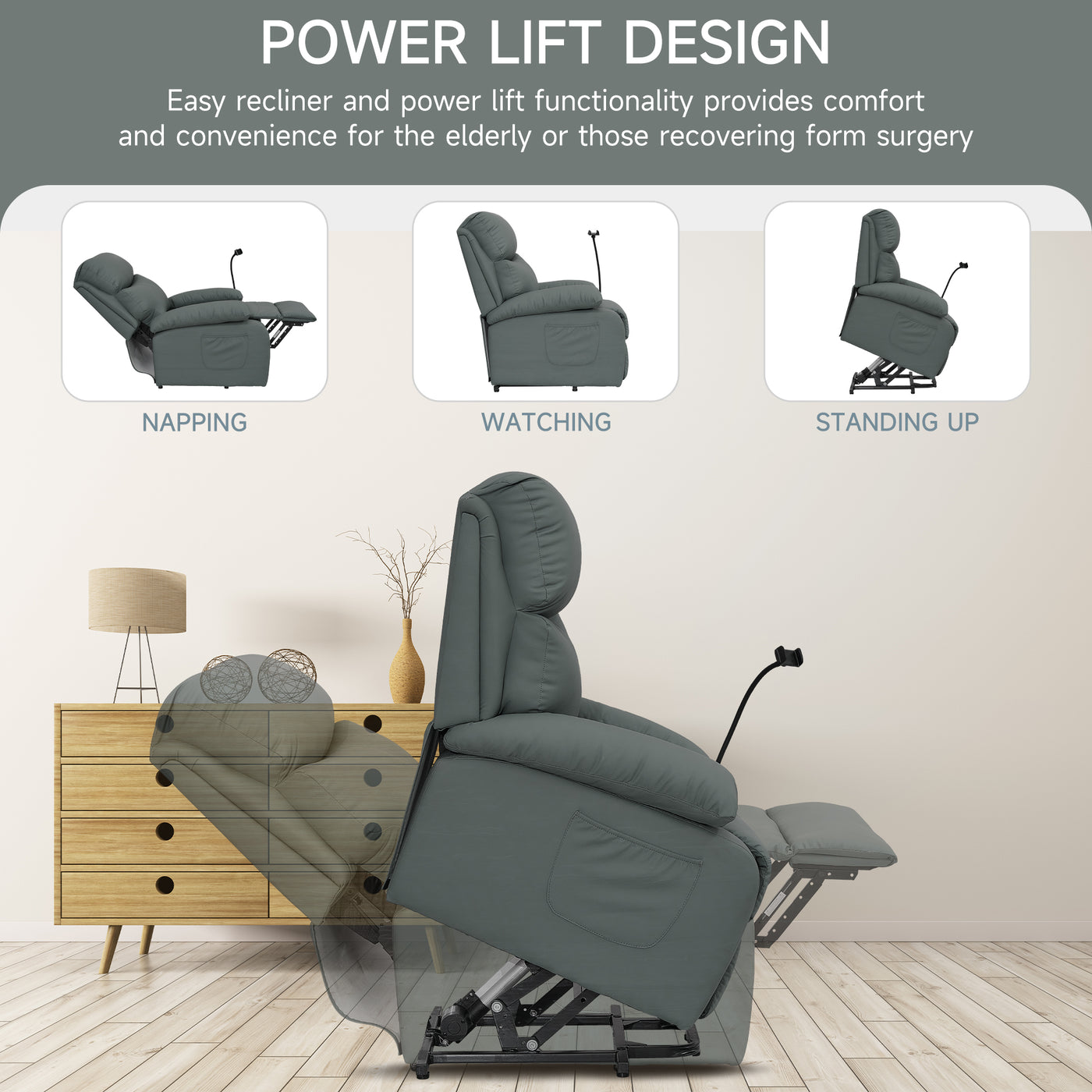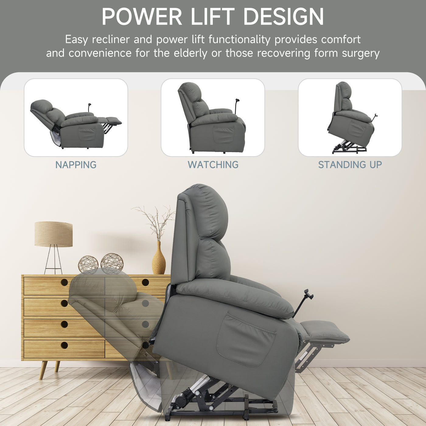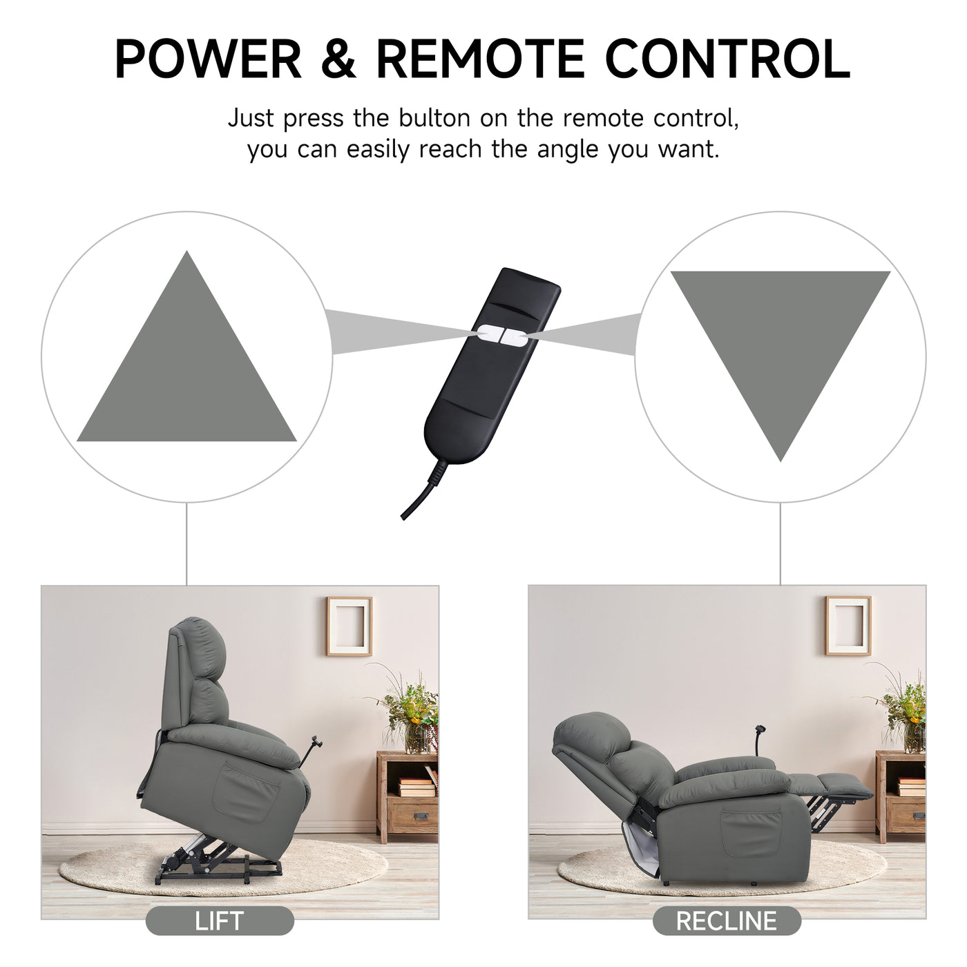 • Power-operated: Electric remote control for easy adjustment of lift and recline angles. Ideal for the elderly. Recline angle between 90-150 degree.